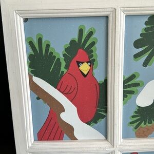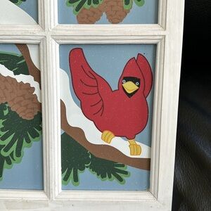 NEW still in the styrofoam packaging, a piece of glass that looks like a window pane, with cardinals and winter evergreens painted on the glass. About 16” tall, 10.75” wide. 1lb 14oz. Perfect for a holiday gift!