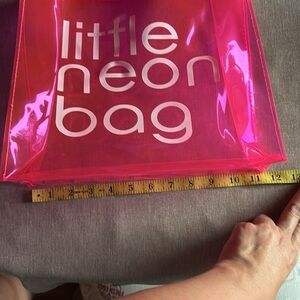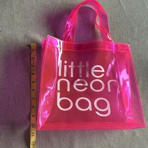 Definitely inspired by the Bloomingdale’s little brown bag, this cute little neon plastic tote is so fun and trendy!