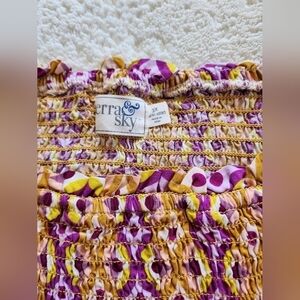 Make a statement in this Terra & Sky Bell Sleeve Smock Top. The smocked bodice, bold print and bell sleeves create a beautiful silhouette for days and nights out. Style with comfortable jeans, jeggings or leggings and heeled sandals to elevate your everyday look.
