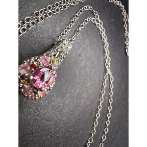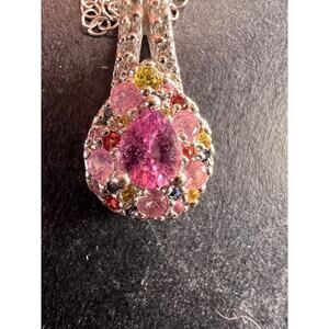 Genuine purple Madagascar sapphire with rainbow multi colored sapphires. Prong set in an authentic 925 sterling silver setting plated with rhodium.85 ctw. Djoy. Made in Thailand. Chain is also sterling silver with a lobster claw clasp and measures 20 inches. Estimated retail value is $750.