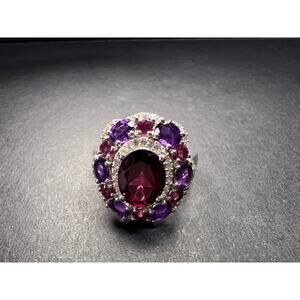 Genuine orissa rhodolite garnet with purple amethyst gemstones prong set in authentic 925 sterling silver plated with rhodium. White accent stones are zircon. Total ctw is 4.00. Measures a size 7. Garnets are natural and untreated. Amethysts are natural and heat treated for color enhancement. Djoy. Made in India. Estimated retail value is $750.