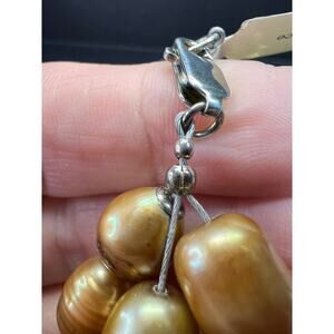 Genuine smoky quartz beads stationed with freshwater cultured pearls dyed a sort of golden yellow to brown color on jewelers wire. 3 stands measuring about 28 inches at the longest length with a 925 sterling silver lobster clasp. Original retail price on tag is $299.