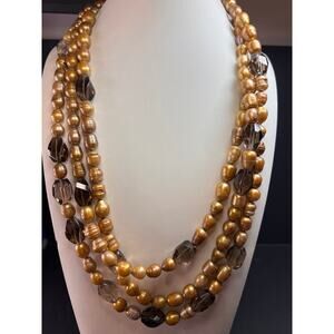 Genuine smoky quartz beads stationed with freshwater cultured pearls dyed a sort of golden yellow to brown color on jewelers wire. 3 stands measuring about 28 inches at the longest length with a 925 sterling silver lobster clasp. Original retail price on tag is $299.