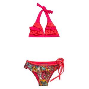 FOR BEST DEALS, VISIT LITTLEFASHIONSBOUTIQUE.COM **** Please size-up on Submarine swimwear, it's cut small. Another absolutely adorable tween girls swimsuit from Submarine. This one has cute hot pink two-tone ruffles all around the halter top and matching sublimated snake skin bottom with a ruffle and side tie