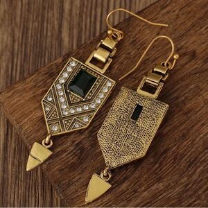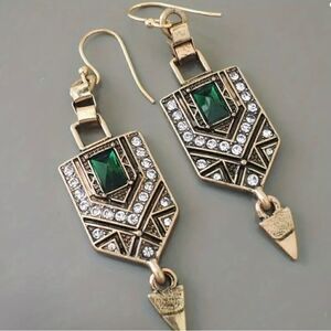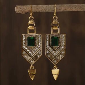 💚 Vintage Geometric Shape Shiny Emerald Gems Inlaid Dangle Earrings Retro Bohemian Style 14K Gold Plated. Gorgeous detail with crystal inlay. Sturdy craftsmanship but not heavy. Simply stunning 💚