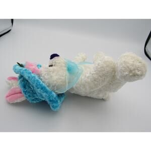Brand new, with tags! This white bunny plush is made of chenille, making it very sorry and cuddly. It is in mint condition, with no rips, tears, threading, or stains. The bunny is sporting a blue sun hat and ribbon around its neck, and its measurements are about 9.5 x 8 x 5 inches.