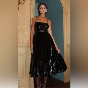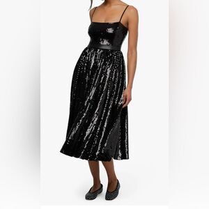 This midi dress is covered in black sequins, with a square neckline, adjustable straps, & a faux leather band at the waist. On the back is a discreet zip closure.