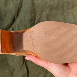 Super cute suede ankle booties from Seychelles. Size 7, fits true to size, erring on slightly large. Beautiful patchwork browns with 2.65” heel.