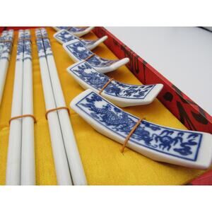 Brand new, never used! This is a gift box featuring four sets of porcelain china chopsticks and accompanying rests. They are white with blue dragon motifs and come in their original box, by "The High-Ranking Present Chopsticks of China." The chopsticks are about 9 inches long.