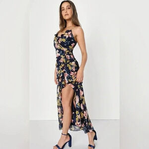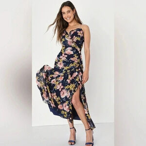 New with tags Lulus Stunning Soiree navy blue floral print ruched midi dress. Made of woven chiffon with metallic threading and a yellow and pink floral print. Features adjustable spaghetti straps, a ruffled surplice neckline, and a fitted bodice. The drop waist has ruching, leading to a column midi skirt with a front slit. Includes a hidden side zipper and clasp. Designed to be snug at the bust and flowy at the natural waist. Can be worn with a strapless bra, adhesive bra, petals, or no bra. The fabric has no stretch, and the length falls to mid-calf. Size M measures approximately 50.5" from the adjustable straps to the hem. The shell is 97% polyester and 3% spandex, and the lining is 95% polyester and 5% spandex. Wash in cold water, do not bleach, line dry, and iron with low heat. The lined dress measures 4" longer at the back. #FormalDress #SophisticatedDress #EveningDress #DinnerDress #CocktailDress #SemiDress #WeddingGuestDress #DesignerDress #SpringDress #SummerDress #TweeChic #RegencyGown #FloralDress #MidiDress