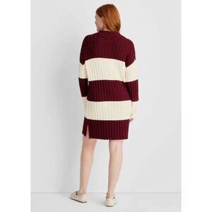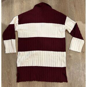 This ribbed sweater dress combines a rich burgundy and cream stripe pattern for a stylish, cozy look. The lightweight material ensures comfort and flexibility.