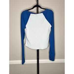 This baseball tee by FP Movement is fabricated with soft, lightweight ribbed material and features sporty colorblock long sleeves, a boatneck, and thumbholes at the sleeves. The curved hem hits at the natural waist and offers a relaxed fit.