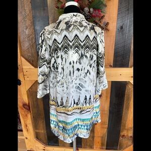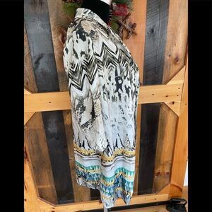 New with tags Setre open front cardigan, size Small. Interesting mix of prints with snakeskin print and abstract design.Open front with fold over collar. Various shades of green, black, and yellow. Has belt loops, no belt. 100% polyester, approximate measurements are pit to pit flat approximately 20”, length from shoulder approximately 30”. Great look with jeans or leggings.