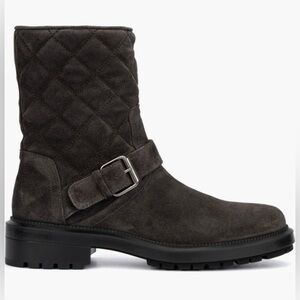 Diamond quilting and a buckled ankle strap lend moto-inspired elements to a supple suede bootie grounded by a durable lug sole.