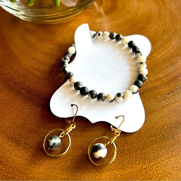 Versatile, trendy zebra jasper semi precious black, white, and grey stretch bracelet & earring set, handmade, original gift. I made a similar set and wear it every other day! It’s by far one of my most favorite sets!