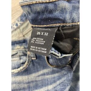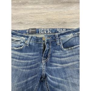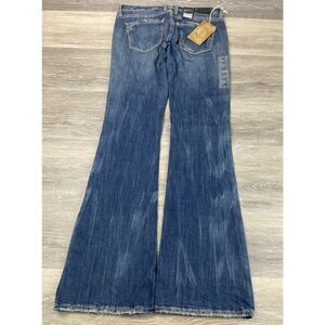 The product is a pair of $95 Buckle Black Fit No. 53 Tailored boot cut stretch jeans in size 26 with a waist size of 30 inches. These jeans are in a distressed blue color with a mid-rise fit. They are machine washable and feature a bootcut style with stretch for added comfort and flexibility. The jeans are from the Buckle Black product line and are designed for a universal fit for women who wear size waist 30” with a 32-inch inseam.