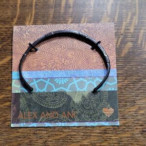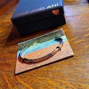 New, never used fun Alex and Ani thin cuff bracelet. Yellow enamel in set. comes attached to insert card. in original box.