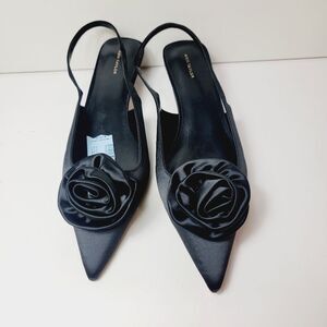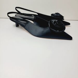 Step out in style with these elegant black slingback heels. Featuring a chic floral detail, these shoes are perfect for any occasion. Pair them with your favorite outfit for a sophisticated look.