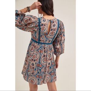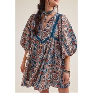 NEW Anthropologie Agathe Lace Puff-Sleeve Spliced V-Neck Tie Mini Dress Small