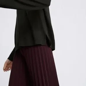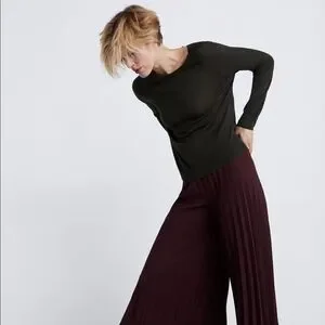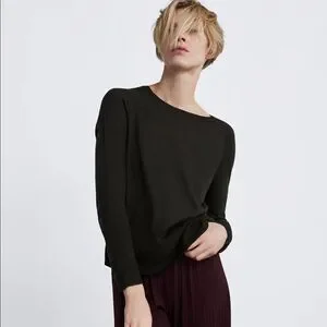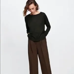 Long sleeve round neck knit sweater. Side vents at hem. Ribbed trim.