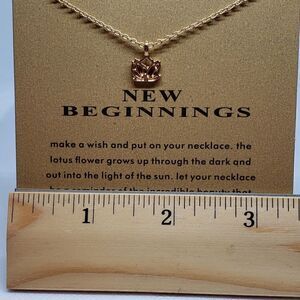 Beautiful goldtone necklace with 16" chain plus extender. Attached is a golden lotus flower. The necklace is attached to a card that tells about starting over. Such a great gift. Comes in organza bag. I have others which are similar so be sure to check them out .