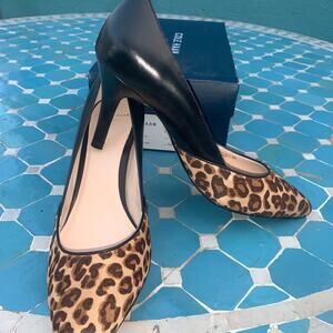 BRAND NEW BLACK LEATHER AND ANIMAL HAIR LEOPARD PRINT PUMPS FROM COLE HAAN. 8b.