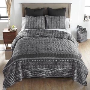 NEW IN BAG! This beautiful Boho Pattern Nomad is a handsome quilted bedding ensemble from featuring a series of geometric and linear shapes, printed with a woven texture as a backdrop. Colors include dark charcoal, grey, taupe and white. The reverse of the quilt is a repeating arrow-like pattern. The set includes a twin size quilt and one standard pillow sham and comes in a free matching tote bag!