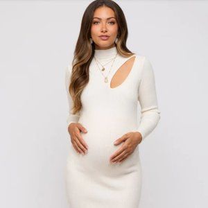 A solid ribbed knit maternity midi dress with a mock neck, cutout detail on chest and back slit.