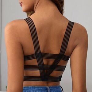 This boho-inspired bralette features a whimsical black daisy crochet design with a V-neckline. Open back with v-shaped design. The fabric is very stretchy, including the straps. Fully lined with removable cups. No closures; it just slips on.