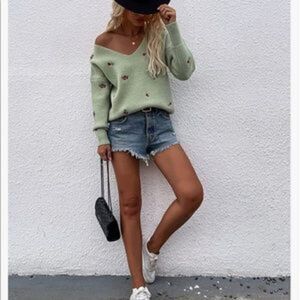 NEW Black V Neck Embroidered Ribbed Knit Pullover Sweater