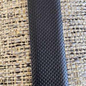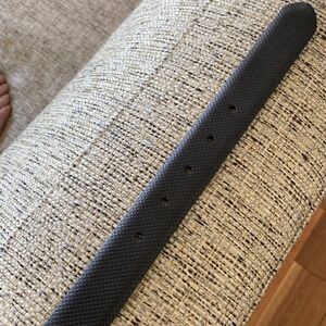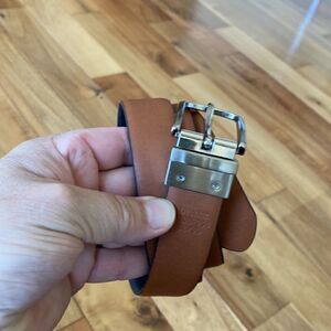 Reversible design - black textured leather and then cognac brown leather in reverse. Silver hardware.