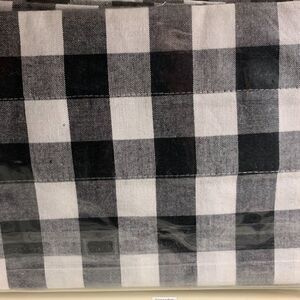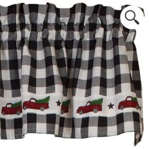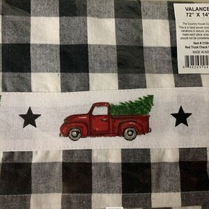 NEW! So cute! Black and White Buffalo Check window valance with red trucks. Very popular for the holidays. This valance is 72" x 14" and is a hand woven product. Made in India. These will go quickly so jump on them fast!!