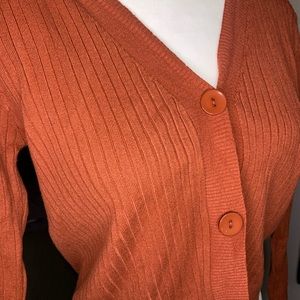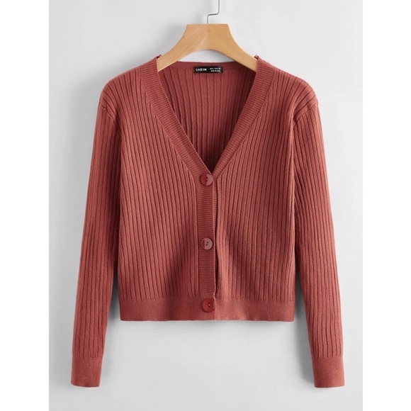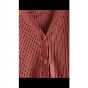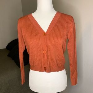 Super cute cardigan! It is brand new, never worn! Didn’t come with tags. Fit too snug on me. The color is a rusty rose, but looks a bit orangey. It’s a medium but I’d say it fits more like a small.