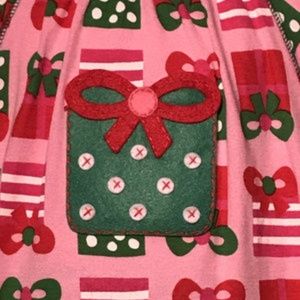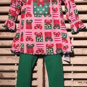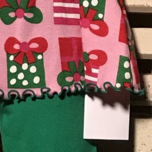Fabric is 100% Cotton. The peasant top is a soft pink knit fabric with Christmas gifts all over om green, red, and hot pink. It has green "lettuce" trim around the hem and sleeves. It has a pretty package applique on the front. Pants are knit in a solid green and they have a ruffle that is red with white polka dots trimmed with green "lettuce" trim around the hem. They are elasticized around the waist for great fit and comfort. Pants are Baxter & Beatrice.