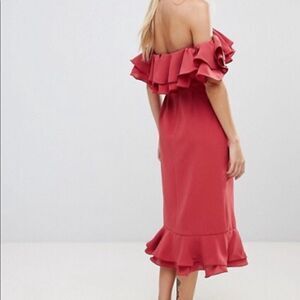 A gorgeous midi length dress by C/meo Collective In rose. An off shoulder style featuring layered ruffle detailing along the neckline and cross over draped hem on the skirt.