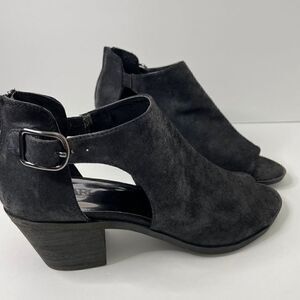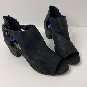 Carlos by Carlos Santana, Black suede leather, block heel, with peep toe, buckle accents and discrete zipper in back.