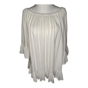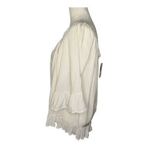 Keywords: Chelsea & Theodore, Petite blouse, off-the-shoulder, peasant blouse, ruffled sleeves, bell sleeves, peplum hem, elasticated neckline, summer blouse, casual wear, white blouse, women's fashion, PXL, rayon blouse, new with tags.