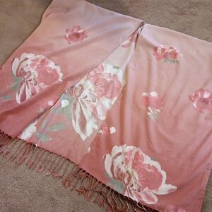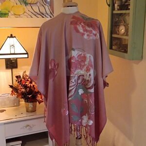 Cozy wrap for all seasons. Super soft woven fabric in a dusty pink floral. Square shape with opening for arms, front panels, solid in back. Fringe at bottom. Measures 41 across, 30 long. A great way to keep warm, and NEW.