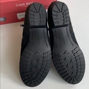 New in box; Super comfy black rubbed leather uppers with tonal geometric pattern on back half; side-zip; cushioned insole; 1 1/4” heel; stock photo of cream boot included to show detail; Cobb Hill shoes and boots are meant to be worn all day long in comfort! Smoke/pet free home.