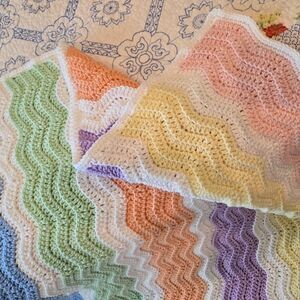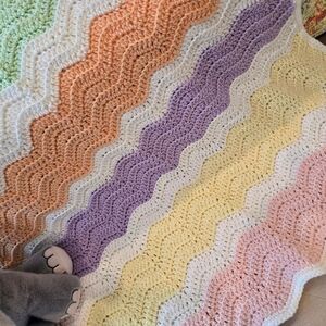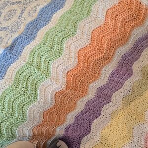 NEW Soft crochet baby blanket with rainbow stripes. Features pastel shades of green, orange, purple, yellow, and pink.