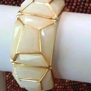 Ivory crystals set with golden highlights on a stretchy band. 1.5" wide. Fits wrist from 5"-9"comfortably.