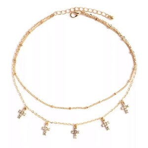This necklace features layered golden chains and details. Adorned with tiny crystal cross pendants. Both layers connected.