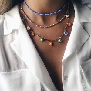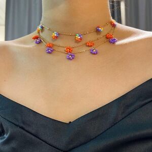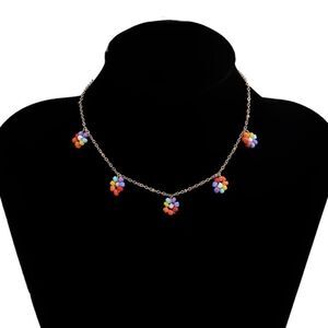 This necklace features a single golden chain and pretty beaded flowers that look like candy sprinkles! Adorned with five colorful beaded daisy flower charms. Perfect for layering.