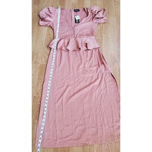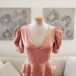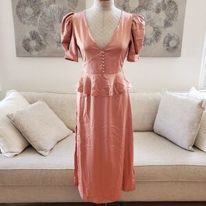 This midi dress mixes dramatic sleeves, elegant buttons and a chic peplum ruffle for a winning revival. Puff sleeves and a pretty peplum perfectly accentuate the waist on this slinky silhouette. By Danielle Bernstein, founder of world-renowned fashion blog WeWoreWhat.