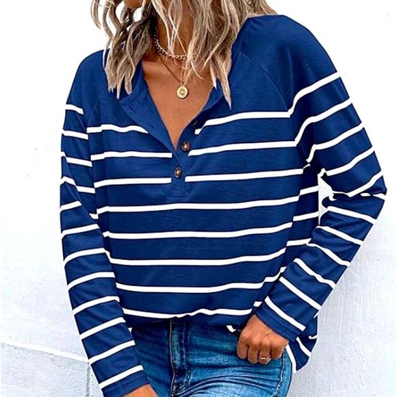 NEW Deep Blue Sea & White Stripe Long-Sleeve Henley - Women XL, XXL