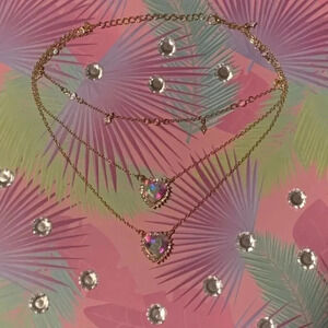 This necklace features layered golden chains adorned with double crystal heart pendants and pretty crystal starburst charms. All layers are connected.