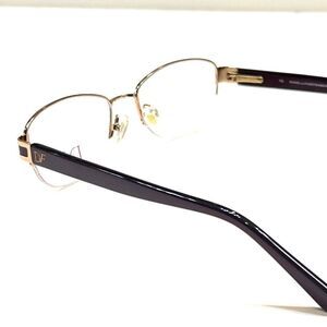 These are new, demo eyeglasses frame that may have been tried on in store. They feature a half metal rim with a glossy gold frame and glossy burgundy temples, complete with spring hinges.