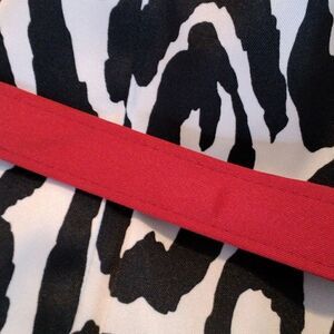 This abstract animal print is dramatic, and made more so by the addition of this red belt. Little tucks at neckline. Princess seams on fitted bodice. Seams on straight skirt. Size 10 measures 38 at chest, 30 at waist, 40 at hips, 39 long from shoulder to hem. The soft, satiny fabric will feel lovely next to your skin, and like NEW.