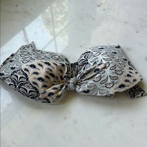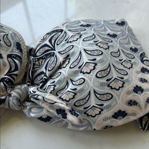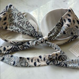 Elegant bikini top with intricate patterns. Features a blend of blue and cream colors. Perfect for a stylish beach day.