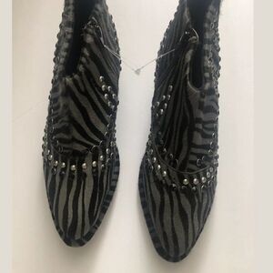 Ultra cool ankle boot with a western-inspired feel. Features an animal-inspired print with a leather or calf hair outer design. Eye-catching stud and stone embellishments strewn throughout. Ever-so-subtle platform and chunky block heel for a cute and comfortable step. Side zipper closure for an easy on-off.